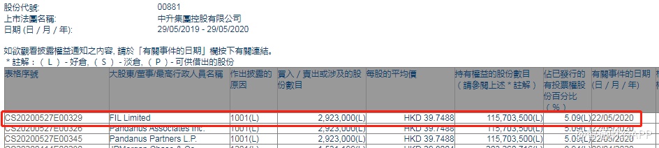 智通财经APP获悉,联交所最新资料显示,5月22日,FIL Limited增持中升控股(00881)292.3万股,每股作价39.7488港元,总金额约为1.16亿港元。智通财经APP获悉,增持后最新持股数目约为1.16亿股,最新持股比例为5.09%。