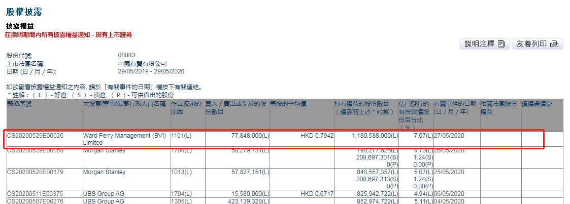 智通财经APP获悉,联交所最新资料显示,5月27日,Ward Ferry Management(BVI)Limited 增持中国有赞(08083)7784.8万股,每股作价0.7942港元,总金额约6182.69万港元。智通财经APP获悉,增持后最新持股数目约为11.8亿股,最新持股比例为7.07%。
