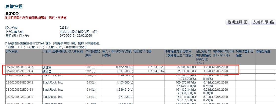 智通财经APP获悉,联交所最新资料显示,5月28日、5月29日,长城汽车(02333)董事长魏建军分别增持长城汽车646.25万股,151.75万股;每股作价分别为4.8923港元、4.8962港元;总金额约为3904.65万港元。智通财经APP获悉,增持后最新持股数目约为3799.85万股,最新持股比例为1.23%。