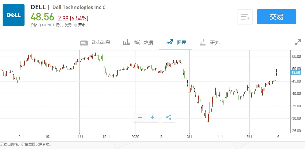 智通财经APP获悉,5月29日,戴尔(DELL.US)一季度营收超预期,开盘大涨,截止北京时间21:48,涨6.54%,报48.56美元。