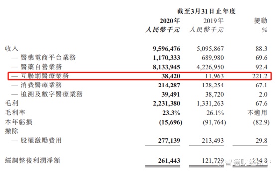 医药电商的业绩固然稳定,而互联网医疗却以高速增长的表现更加亮眼。年内互联网医疗收入3842万,营收占比仅0.4%,不过却有221%的同比增速。