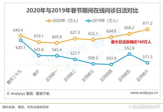 而一季度公共卫生事件的发展,可以说进一步推动了这种变化的提早出现;伴随公共卫生事件改变的,还有患者的习惯,由于各地的管制措施,2020年春节期间患者线上问诊的积极性显著提升,易观数据显示春节期间比去年线上问诊的人数平均同比增加近30%。