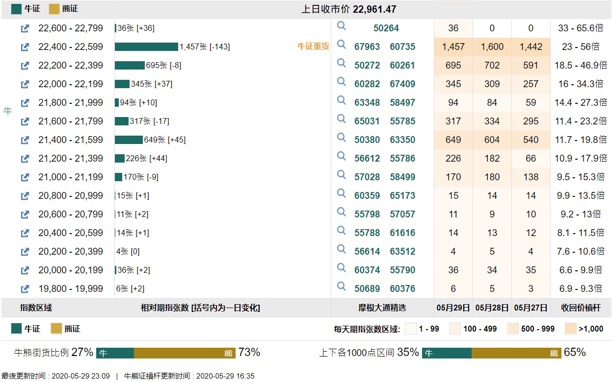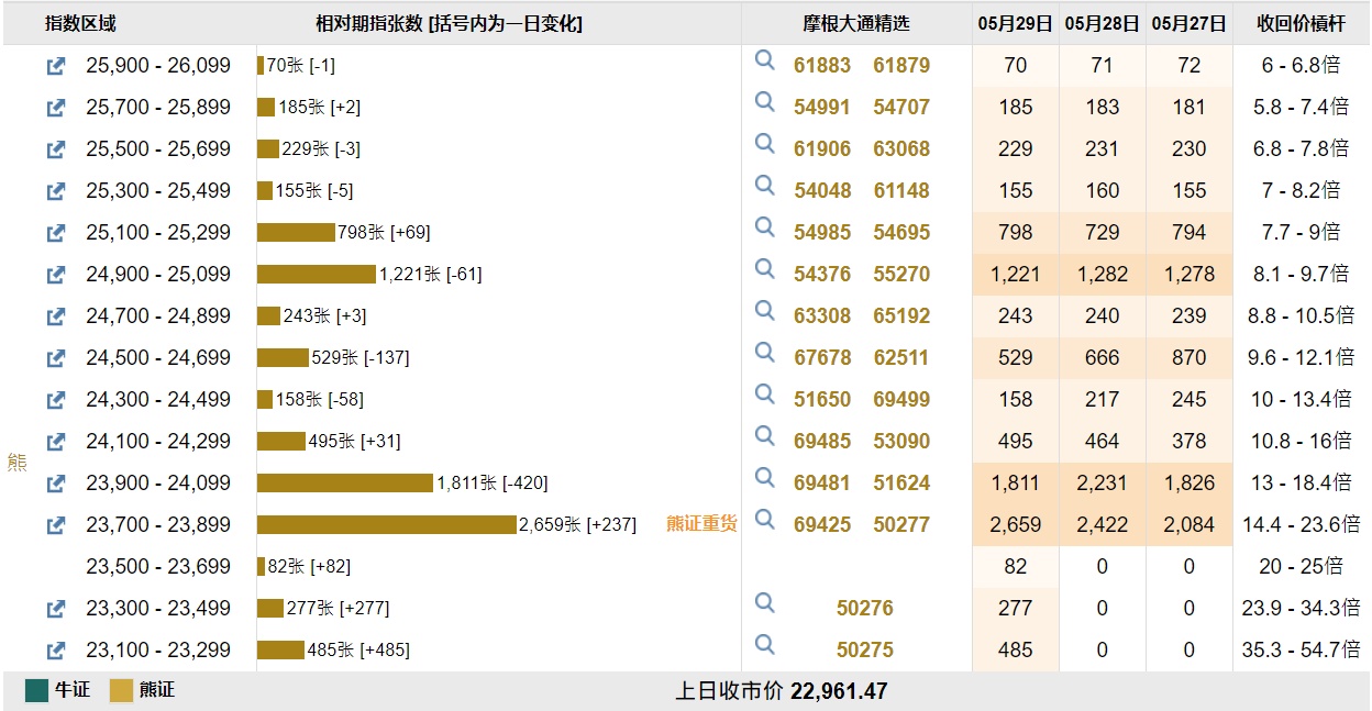 智通财经APP获悉,截至5月29日,恒指最新的牛熊街货比例27:73。摩根恒指牛熊证街货分布图中的数据显示,熊证街货重货区在23700-23899区间,该区间最新熊证数量为2659张,较上一交易日增加237张,最多新增区间在23100-23299区间,该区间最新熊证数量为485张,新增485张。牛证街货重货区在22400-22599区间,该区间最新牛证数量为1457张,较上一交易日减少143张,最多新增在21400-21599区间,该区间最新牛证数量为649张,新增45张。