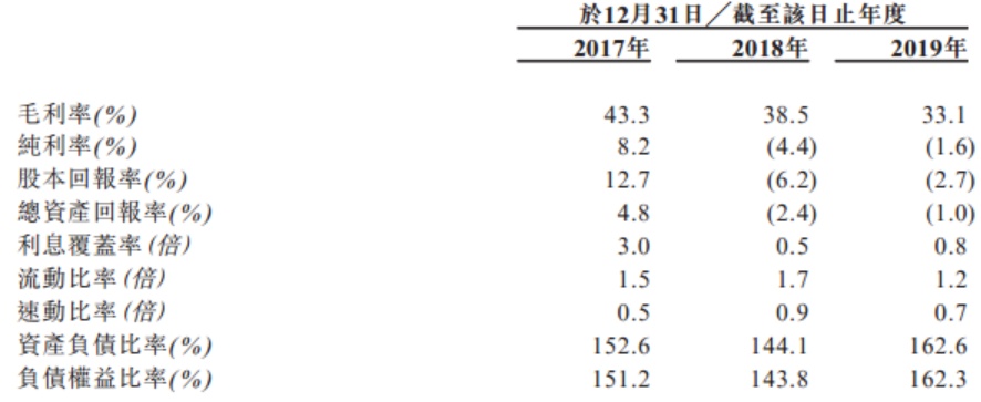 毛利率由2017年的43.3%逐步将至2019年的33.1%,纯利率则由2017年的8.2%降至2019年的负1.6%。