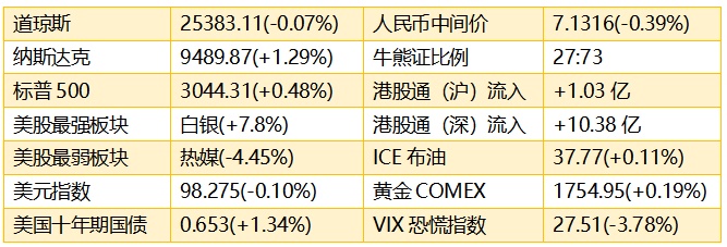 1、上周五,投资者情绪紧张,美股开盘涨跌互现,盘中三大指数两度触底,随后温和转升,最终部分高收。截至收盘,标普500指数涨14.60点,涨幅0.48%,报3044.31点;纳指涨120.90点,涨幅1.29%,报9489.87点;道指跌17.50点,跌幅0.07%,报25383.11点。港股ADR指数按比例计算,收报23193点,涨232.22点或1.00%。