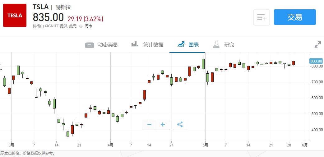 智通财经APP获悉,6月1日(周一)美股盘前,特斯拉(TSLA.US)走高,截至北京时间16:04,该股涨3.23%,报862美元。