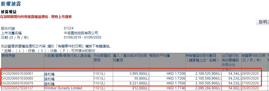 智通财经APP获悉,联交所最新资料显示,5月27-29日,中渝置地(01224)主席兼执行董事张松桥连续3个交易日分别增持该公司922.1万、5.5万、396.5万股,合计1324.10万股,每股作价分别为1.75港元、1.72港元、1.72港元,总金额约为2305.12万港元。智通财经APP获悉,增持后最新持股数目为21.10亿股,最新持股比例为54.34%。