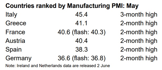 智通财经APP获悉,6月1日,IHS Markit公布欧元区5月制造业PMI数据。欧元区5月制造业PMI终值39.4,初值39.5,4月终值33.4。