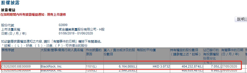 智通财经APP获悉,联交所最新资料显示,5月27日,贝莱德增持紫金矿业(02899)616.4万股,每股作价3.0732港元,总金额约为1894.32万港元。智通财经APP获悉,增持后最新持股数目约为4.04亿股,最新持股比例为7.05%。
