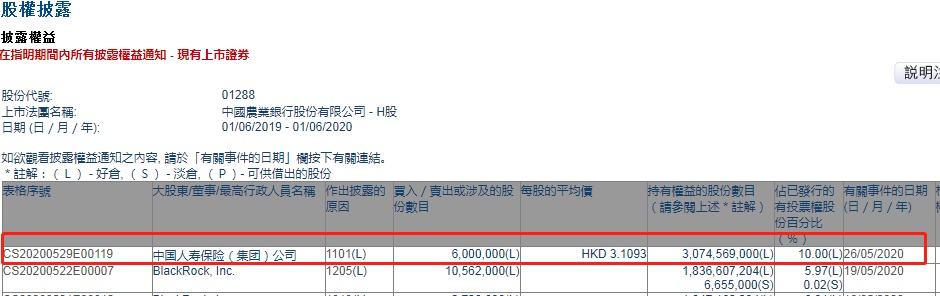 智通财经APP获悉,联交所最新资料显示,5月26日,中国人寿保险(集团)公司增持农业银行(01288)600万股,每股作价3.1093港元,总金额为1865.58万港元。增持后最新持股数目约为30.75亿股,最新持股比例为10%,触发二次举牌。