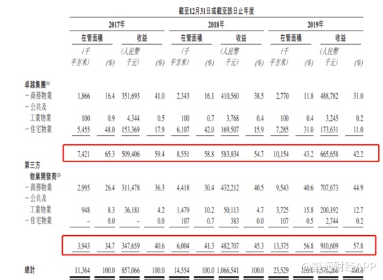 智通财经APP注意到,2018年之前,卓越商企的在管面积多数来自卓越集团,2017年和2018年分别占比65.3%和58.8%,相应的收入占比也分别达到59.4%和54.7%。这部分在管面积又以住宅物业为主,2017年和2018年分别达到48%和42%。