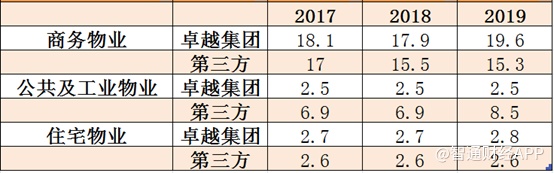 因此2019年来自第三方的商务物业的收入占比达到44.9%,而值得一提的是,商务物业的平均管理费用远远高于公共及工业物业、住宅物业,这也是卓越商企业绩增长的核心。