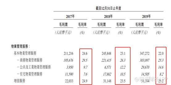 可以看到,卓越商企来自第三方的住宅物业基本处于零增长状态,而聚焦于商务物业和公共及工业物业,主要也是因为住宅物业管理费用低,盈利空间小。从招股书中也可以看到,商务物业管理的毛利率基本是其他两种业务的2至3倍。