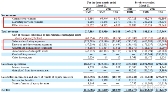 2020财年,蘑菇街营收8.35亿元,同比下降22.2%,其中佣金收入下滑13.7%,营销服务收入下滑38.6%。公司当期净亏损达到22.23亿元。