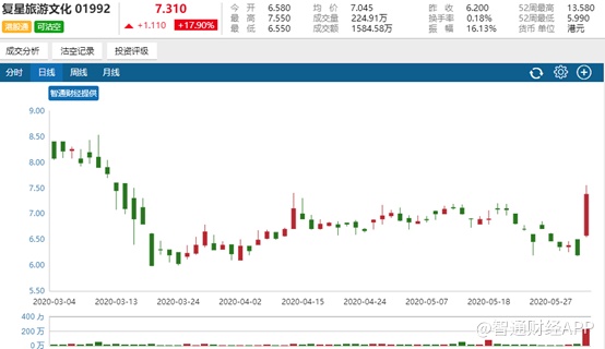 智通财经APP观测到,在《海南自由贸易港建设总体方案》公布次日,复星旅文早盘低开后迅速直线拉升至涨10%后随即走稳,直至尾盘又有大规模资金入场,再度大幅攀升,一日暴涨近18%,收至7.31港元。