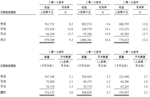 招股书显示,收益由2017财年的人民币9.79亿元增至2018财年的人民币10.06亿元,增长或2.8%。有关增加主要是由于公司的主要产品双层瓦楞纸板的收益主要因鹤山工厂于2015年开始生产后业务持续增长及客户认可度增加而增加,因同期单层瓦楞纸板及单面瓦楞纸板产生的收益略减而遭抵销。公司的收益由2018财年的人民币10.06亿元减至2019财年的人民币7.786亿元,减少22.6%。有关减少主要是由于双层瓦楞纸板及单层瓦楞纸板所得收益下降。