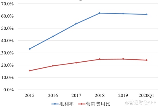 2020Q1,宝尊的非经销模式GMV占比保持在91.5%,而服务收入占比增至54%,同时总体毛利率为61.3%,均与2019年保持基本持平。而值得一提的是,Q1公司的营销费用占比反而略有下降至24%,比2019年的25%下降1个百分点,也低于2018年的24.8%。
