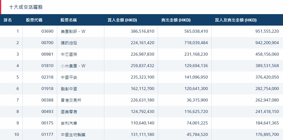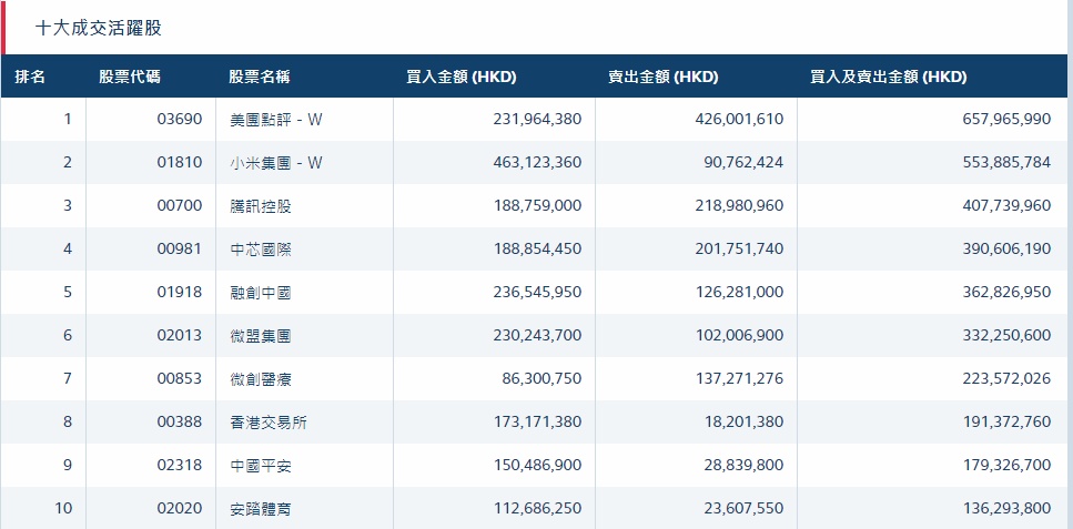 此外,中国平安(02318)、安踏体育(02020)、吉利汽车(00175)分别获净买入2.15亿、8907万、3663万港元。而微创医疗(00853)、中芯国际(00981)分别遭净卖出5097万、1707万港元。