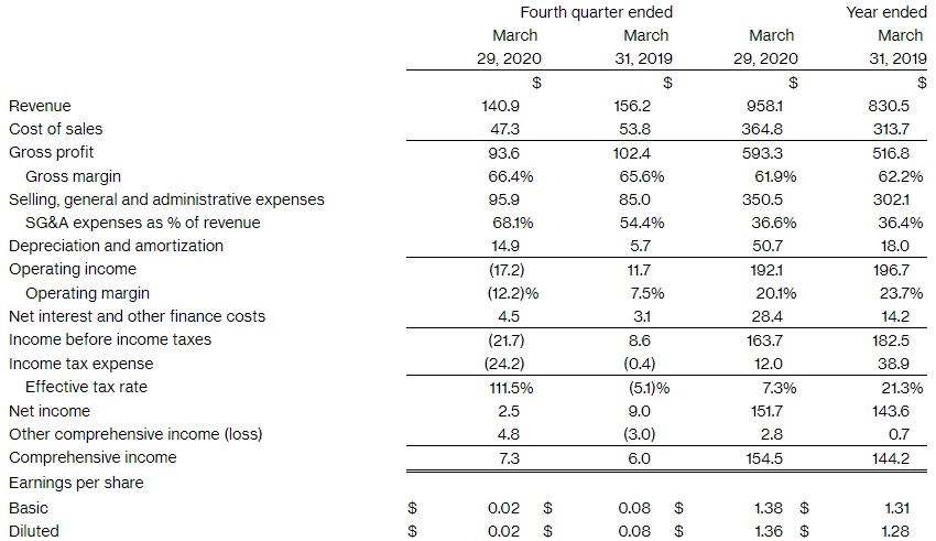 智通财经APP获悉,高端冬季服装制造商加拿大鹅(GOOS.US)于6月3日美股盘前公布了截至2020年3月29日的2020财年第四季度及全年业绩。