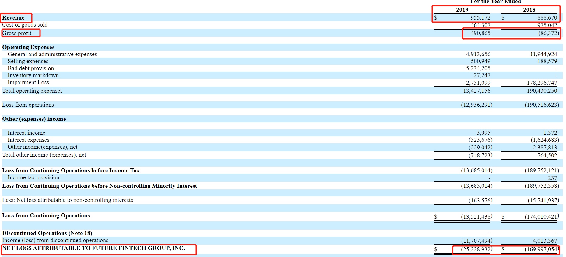 2019年未来金融科技全年营收为95.5万美元,较2018年同期的88.8万元人民币上涨7.5%; 毛利由2018年的亏损8.63万美元大幅上涨到49.08万美元,实现扭亏为盈; 2019年净亏损为2522.8万美元,2018年为1.70亿美元,亏损大幅度收窄。