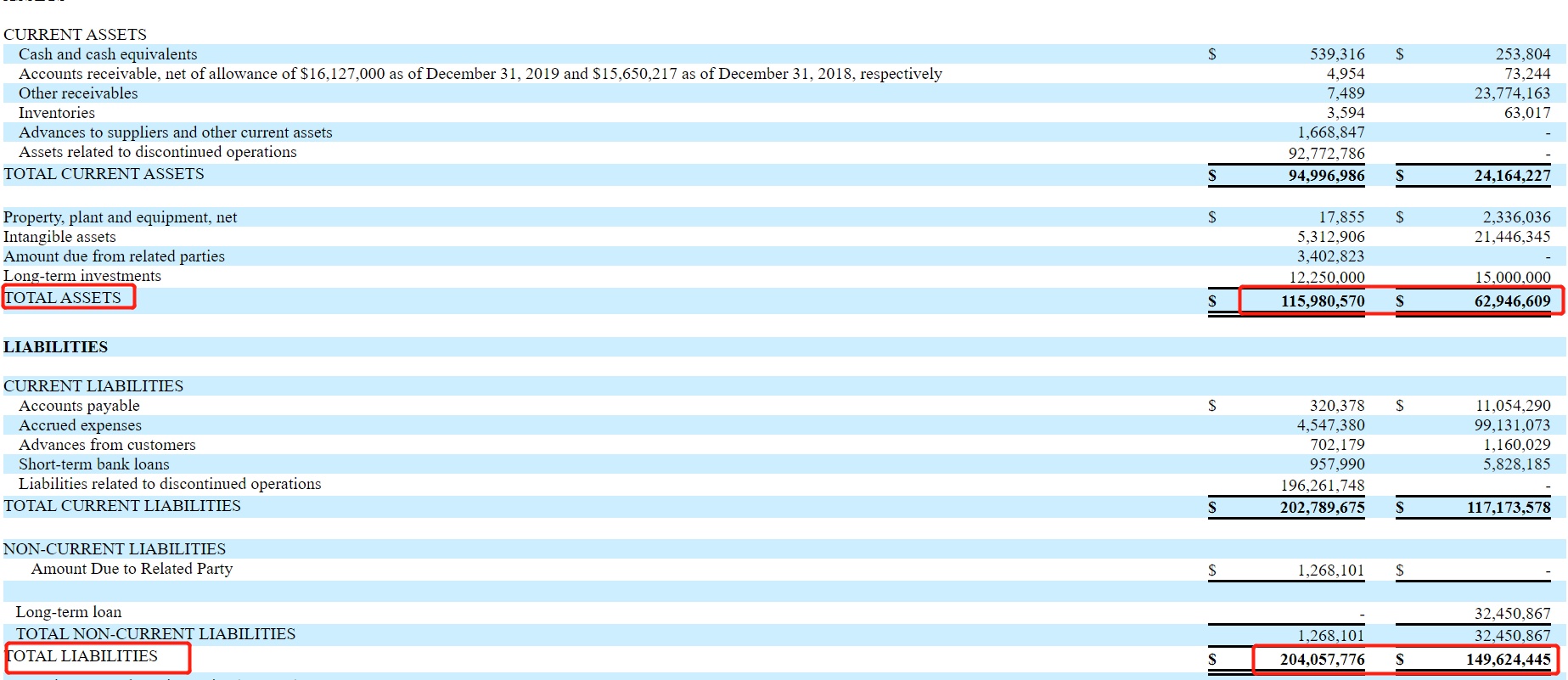截至2019年12月31日,公司总资产为1.16亿美元,去年同期为6294.7万美元;公司总负债为2.04亿美元,去年同期为1.50亿美元。