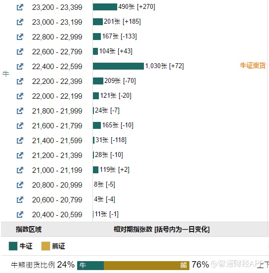 智通财经APP获悉,截至6月3日,恒指最新的牛熊街货比例24:76。摩根恒指牛熊证街货分布图中的数据显示,熊证街货重货区在24900-25099区间,该区间最新熊证数量为1879张,较上一交易日增加161张,最多新增在24700-24899区间,该区间最新牛证数量为769张,新增281张。牛证街货重货区在22400-22599区间,该区间最新牛证数量为1030张,较上一交易日增加72张,最多新增在23200-23399区间,该区间最新牛证数量为490张,新增270张。