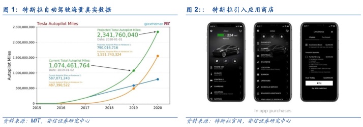 ■ 特斯拉软件创收动作频频, 软件收入成为特斯拉商业模式重要一环。根据特斯拉2019年Q4季报,特斯拉第四季度首次推出了“高级连接”功能,用户每月只需支付9.9美元的费用就可以使用流媒体、浏览互联网或查看实时路况等功能。除此之外,特斯拉还引入了应用商店(in app purchases),特斯拉车主可以在这里购买各种软件更新,包括基本辅助自动驾驶和完全自动驾驶套件以及提升加速性能等,未来随着特斯拉应用生态的建立,有可能向苹果应用商店一样,抽取应用商店其他软件商的销售分成。从硬件到软件再到提供互联网应用服务,特斯拉打造的不仅仅是交通工具,更是一个智能创收平台。根据特斯拉 Q1 财报,特斯拉与互联网连接和全自动驾驶(“ FSD”)功能以及关于空中软件更新等相关的递延收入余额超过 15 亿美元,软件收入已经成为特斯拉商业模式的重要一环。