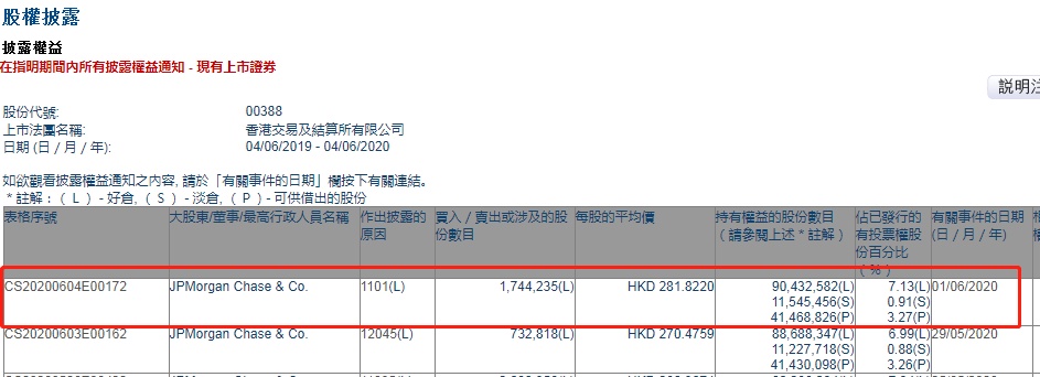 智通财经APP获悉,联交所最新资料显示,6月1日,小摩增持港交所(00388)174.4235万股,每股作价281.822港元,总金额约为4.92亿港元。增持后最新持股数目约为9043.26万股,最新持股比例为7.13%。