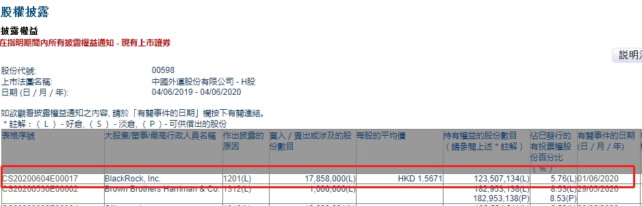 智通财经APP获悉,联交所最新资料显示,6月1日,贝莱德减持中国外运(00598)1785.8万股,每股作价1.5671港元,总金额约为2798.53万港元。减持后最新持股数目约为1.24亿股,最新持股比例为5.76%。