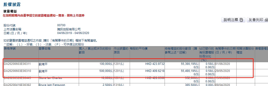 智通财经APP获悉,联交所最新资料显示,5月29日和6月1日,总裁刘炽平分别减持腾讯控股(00700)50万股和10万股,每股平均作价分别为409.6218港元及423.9732港元,总金额约为2.47亿港元。减持后最新持股数目约为5539万股,最新持股比例为0.58%。