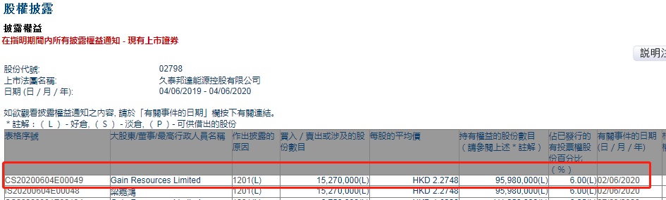 智通财经APP获悉,联交所最新资料显示,6月2日,Gain Resources Limited减持久泰邦达能源(02798)1527万股,每股作价2.27港元,总金额约为3473.62万港元。减持后最新持股数目约为9598万股,最新持股比例为6.00%。