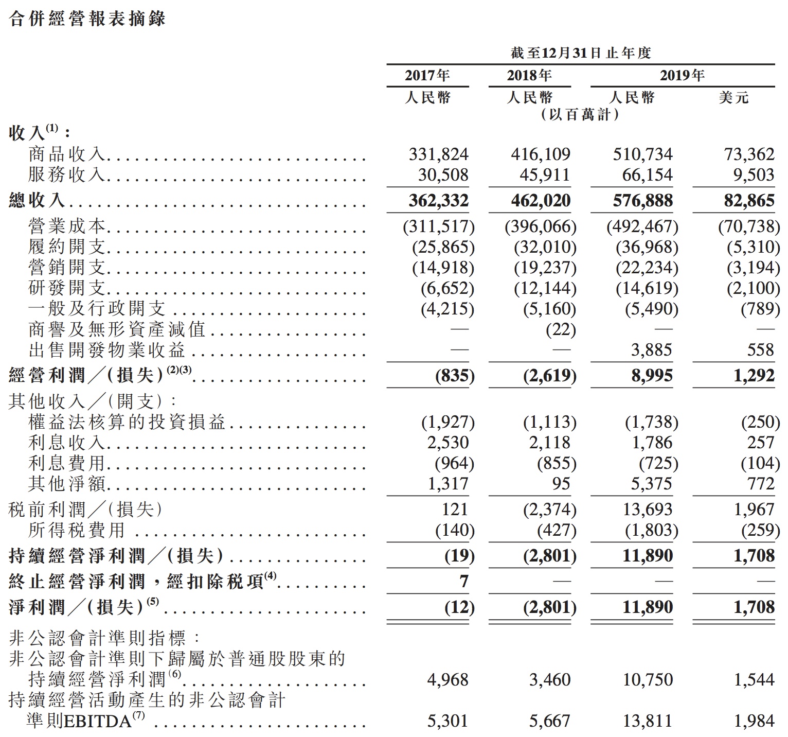 2017年、2018年及2019年公司净收入分别为3623亿元(人民币,下同)、4620亿元和5769亿元。2017年及2018年持续业务的经营净亏损分别为1900万元和28.01亿元,而2019年持续业务的经营净利润达到118.9亿元。