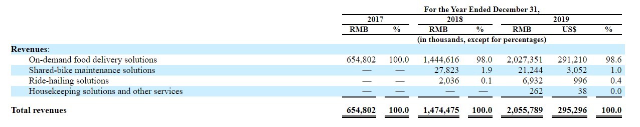 目前公司业务主要涵盖:提供外卖按需送餐的解决方案、共享单车维护运营的解决方案、叫车出行的解决方案、管理解决方案和其他服务;其中提供外卖送餐解决方案是营收的绝对部分。