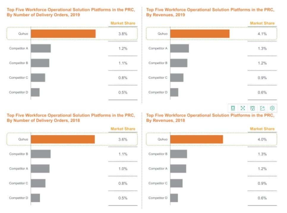 根据趣活的招股书披露,2018年趣活在提供外卖送餐解决方案业务中,订单份额以及营收的国内市场份额分别占到3.6%和4.0%;2019年趣活在提供外卖送餐解决方案业务中,订单份额以及营收的国内市场份额分别占到3.8%和4.1%,均占据行业榜首位置。