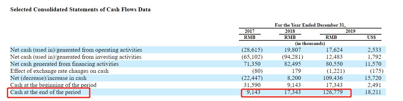根据趣活的招股说明书披露,营收从2017年的6.54亿元人民币上涨到2019年的20.55亿元人民币;毛利从2017年的2860.9万元人民币上涨到1.62亿元人民币;净亏损由2017年的1396.9万元人民币下降到2019年的1344.9万元人民币,基本保持持平;另外,公司所持现金流从2017年的914.3万元人民币上涨到2019年的1.26亿元人民币,实现跨越性增长。