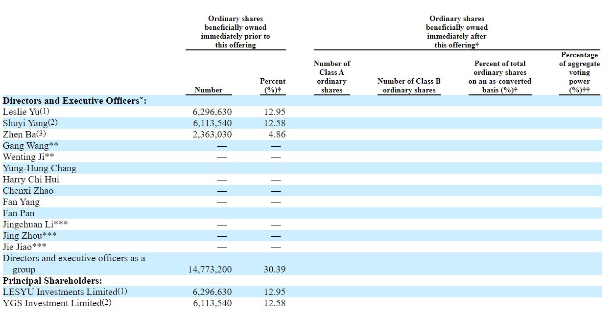 根据招股书显示,趣活在上市前的股权结构中,董事长兼总经理Leslie Yu通过LESYU Investments Limited持股12.95%;联合创始人杨树轶通过YGS Investment Limited持股12.58%,公司首席营销官Zhen Ba通过BZB Investment Limited持股4.86%;三位公司管理层人员共持股30.39%。
