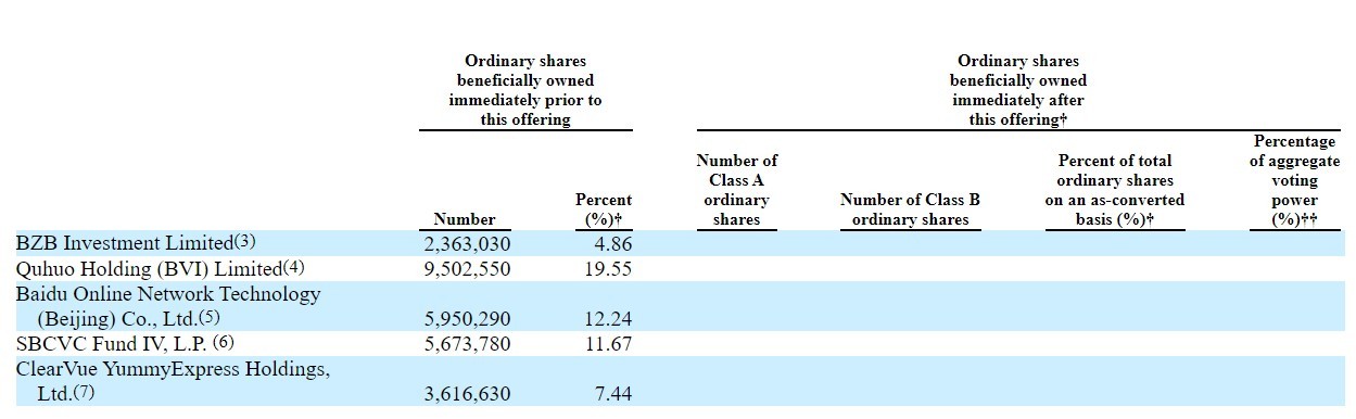 另外,Quhuo Holding (BVI) Limited持股19.55%;百度(BIDU.US)持股12.24%;SBCVC Fund IV, L.P.持股11.67%;ClearVue YummyExpress Holdings, Ltd持股7.44%。