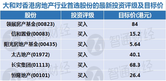 大和对香港房地产行业首选股份的最新投资评级及目标价(表)