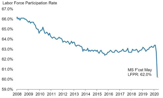 参与率在4月份下降2.5%后,预计将维持在60.2%不变。如果劳动力参与率下降,失业率将下降。例如,如果参与率下降20个基点至60.0%,失业率将从17.0%降至16.7%。从就业人口转变为非劳动人口的流动比以往任何时候都高,这是由于紧急纾困法案规定,即使工人没有积极寻找工作也符合领取失业保险福利的资格。