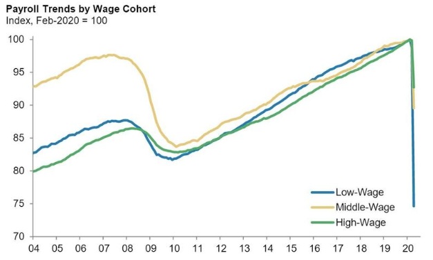 因此,薪资的大幅上涨并不是一个积极因素,如果失业率继续攀升,在经济复苏期间工资增长将面临压力。在4月份的就业报告中,失业人数广泛分布在各个行业,但失业率下降最严重的是劳动力市场中薪资较低的部门。这意味着收入相比上月增加了4.7%的数据中存在结构偏差。预计5月份的裁员将更加均匀地分布在整个薪酬体系中。