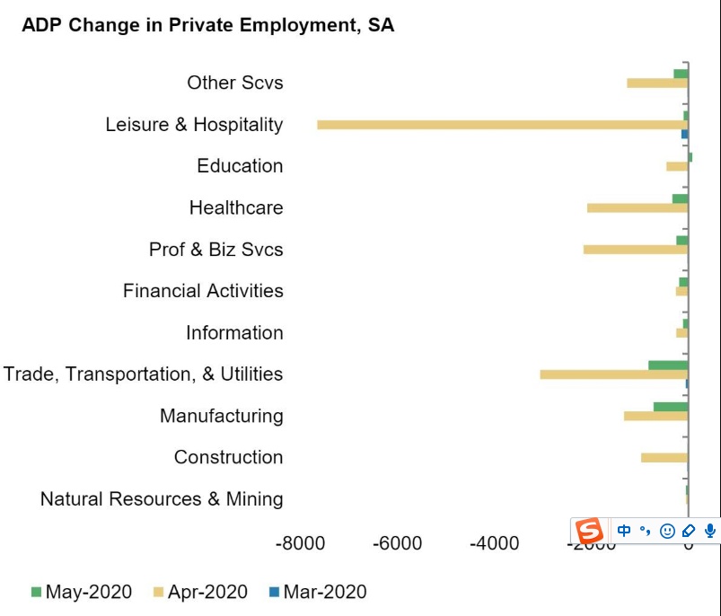 ADP报告称,5月份美国经济损失了276万份工作,好于华尔街预期的900万份;4月份的数字也从最初的减少2024万修正为减少1956万。