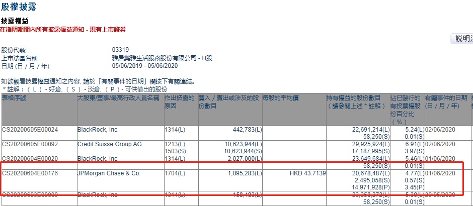 智通财经APP获悉,联交所最新资料显示,6月1日,小摩减持雅生活服务(03319)109.53万股,每股作价43.7139港元,总金额约为4787.91万港元。减持后最新持股数目约为2067.85万股,最新持股比例为4.77%。