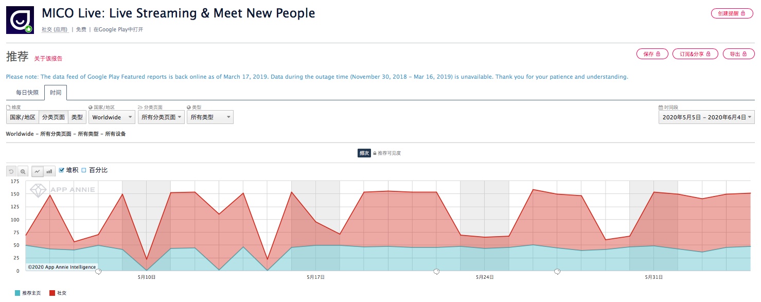 此外,MICO长期以来持续获得Google Play高频次的首页推荐。近5日来,MICO在Google Play的日推荐次数维持在150左右,其中包括美国、巴西、印尼、墨西哥、土耳其等国家的Google Play的主页推荐。