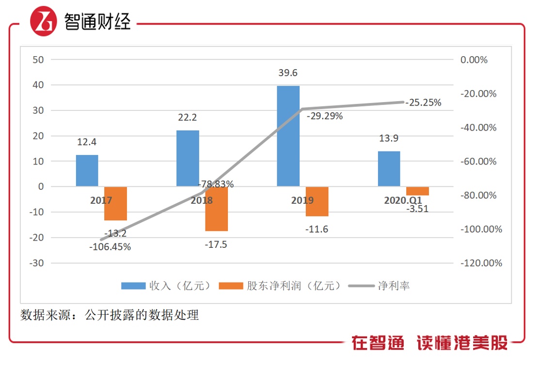 该公司目前仍未现盈利,但出现了盈利的“迹象”,2019年Q3以来已经实现三个季度正的毛利润,2020年Q1,毛利率为5.1%。期间该公司的净亏损3.51亿元,如果以数字看,同比是扩大的,但以利润率看,亏损率是改善的,为25.25%,相比于2017年提升了81.2个百分点。