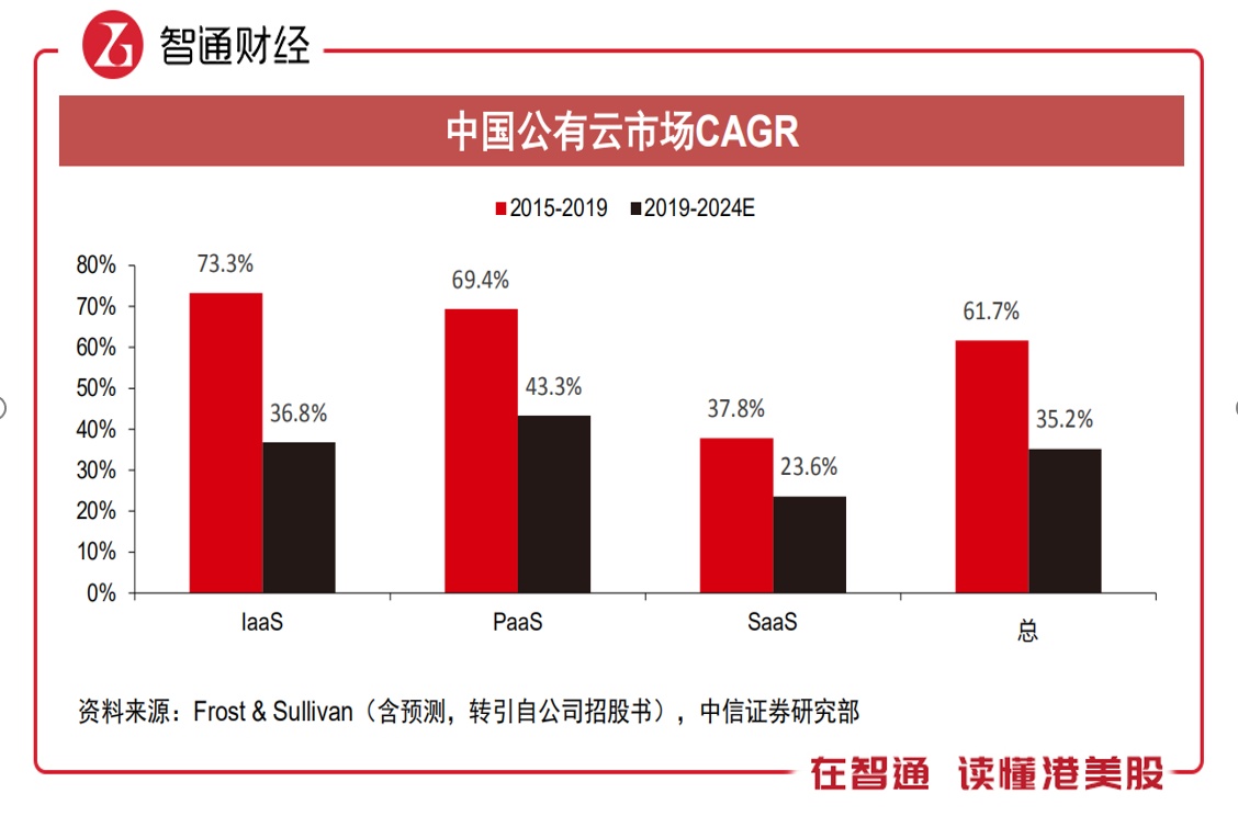 金山云的高成长得益于行业的机会,根据Frost & Sullivan公司的数据,2019年中国公有云市场规模814亿元,近五年复合增长率为61.7%,其中LaaS为73.3%,PaaS为69.4%,以及SaaS为37.8%,未来五年仍保持中高双位数的增长速度。2019年,美国49.4%的传统企业和公共服务机构使用云服务,而中国只有10.5%,成长空间很大。