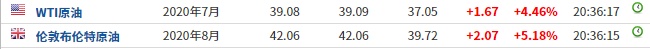 截至发稿,WTI原油涨4.46%,报39.08美元/桶。布伦特原油涨5.18%,报42.06美元/桶。