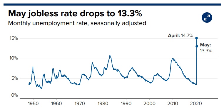 智通财经APP获悉,美国劳工部今日(周五)公布的美国5月非农数据显示,5月份美国非农就业人数惊人地增加了250万人,失业率降至13.3%。这一数据远好于经济学家此前的预期,表明经济复苏可能就在眼前。