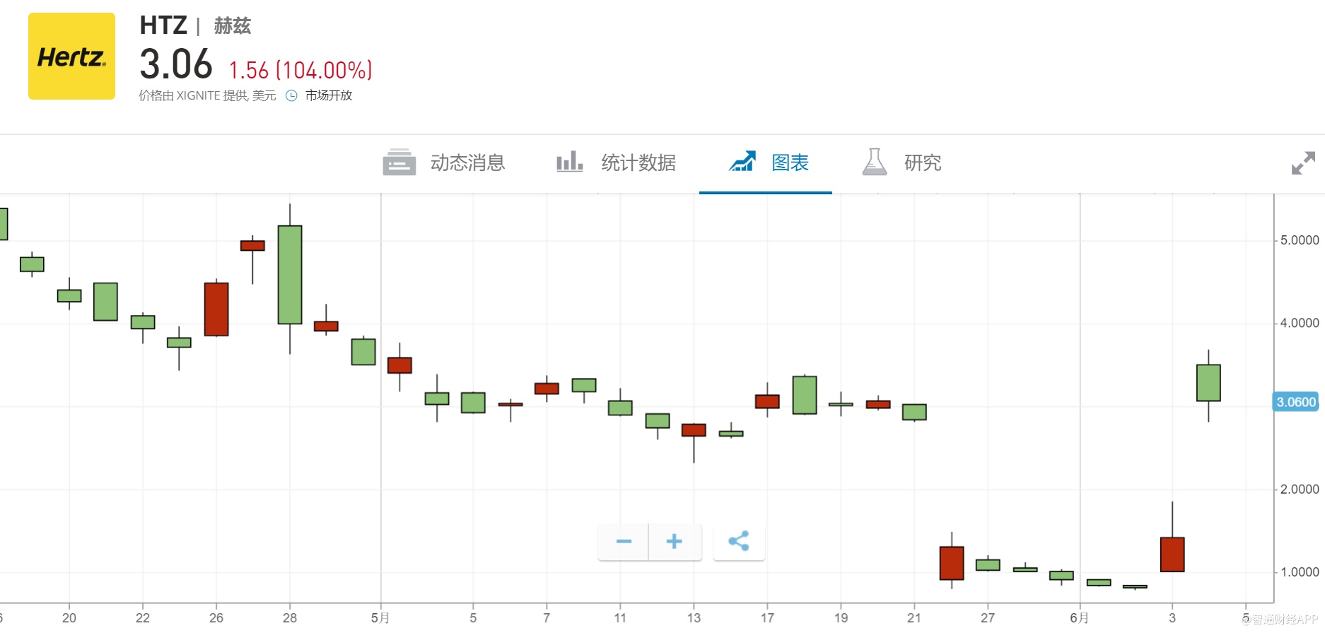智通财经APP获悉,6月5日(周五)美股盘初,赫兹(HTZ.US)股价拉涨,成交量超过1.84亿,为连续第二日上涨。截至北京时间23:00,该股涨104%,报3.06美元。值得注意的是,该股两日累计涨幅高达284%。