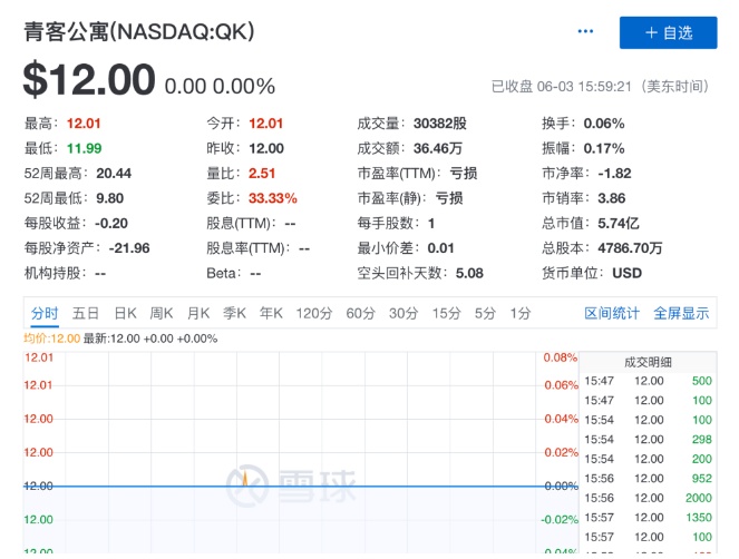 另外,上市之后的青客公寓股价表现并不理想。通过观察其股价走势可以发现,二级市场的股民对青客似乎并不感兴趣,甚至还出现过一天之内股票零成交的情况。如今,青客公寓的股票交易已经陷入停滞,公司市值也仅剩5.74亿美元。
