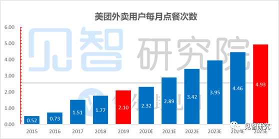 (1)美团2019年全年交易用户数是4.5亿,见智基于其历史披露的数据,以及其与市场的沟通,推测美团2019年在美团上点过单的外卖用户数大约3.5亿,一个用户一个月仅点单2次。